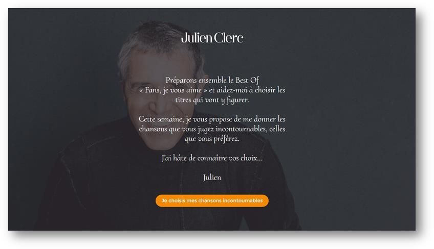 Julien Clerc propose à ses fans de l’aider à choisir les titres de son Best Of « Fans, je vous aime » en se rendant sur le site : www.fansjevousaime.fr